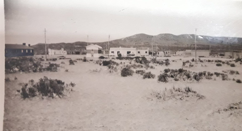 Paisaje caletese que data aproximadamente del año 1957. Lugar dónde estaban los antiguos pabellones de YPF, al lado de la ruta nacional N° 3 y desde dónde se puede ver el conocido Hotel «Munich».